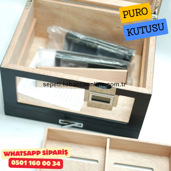 Şık siyah tasarımı ve güçlü yapısıyla öne çıkan bu humidor, purolarınızı ideal nem koşullarında uzun süre saklamak için geliştirilmiştir.