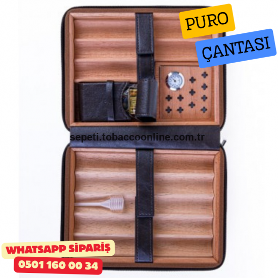 İç bölümde klasik nemlendirici ve analog nem göstergesi alanı yer almakta; ayrıca deri sabitlemeli özel çakmak bölmesi sayesinde tüm ekipmanlar tek çanta içinde düzenli şekilde taşınabilir.